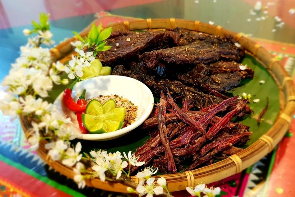 La viande de buffle séchée à la fumée, légèrement épicée, se conserve pour l’hiver. Elle accompagne souvent le riz ou se goûte à l’apéritif dans les villages thaïs ou hmongs.