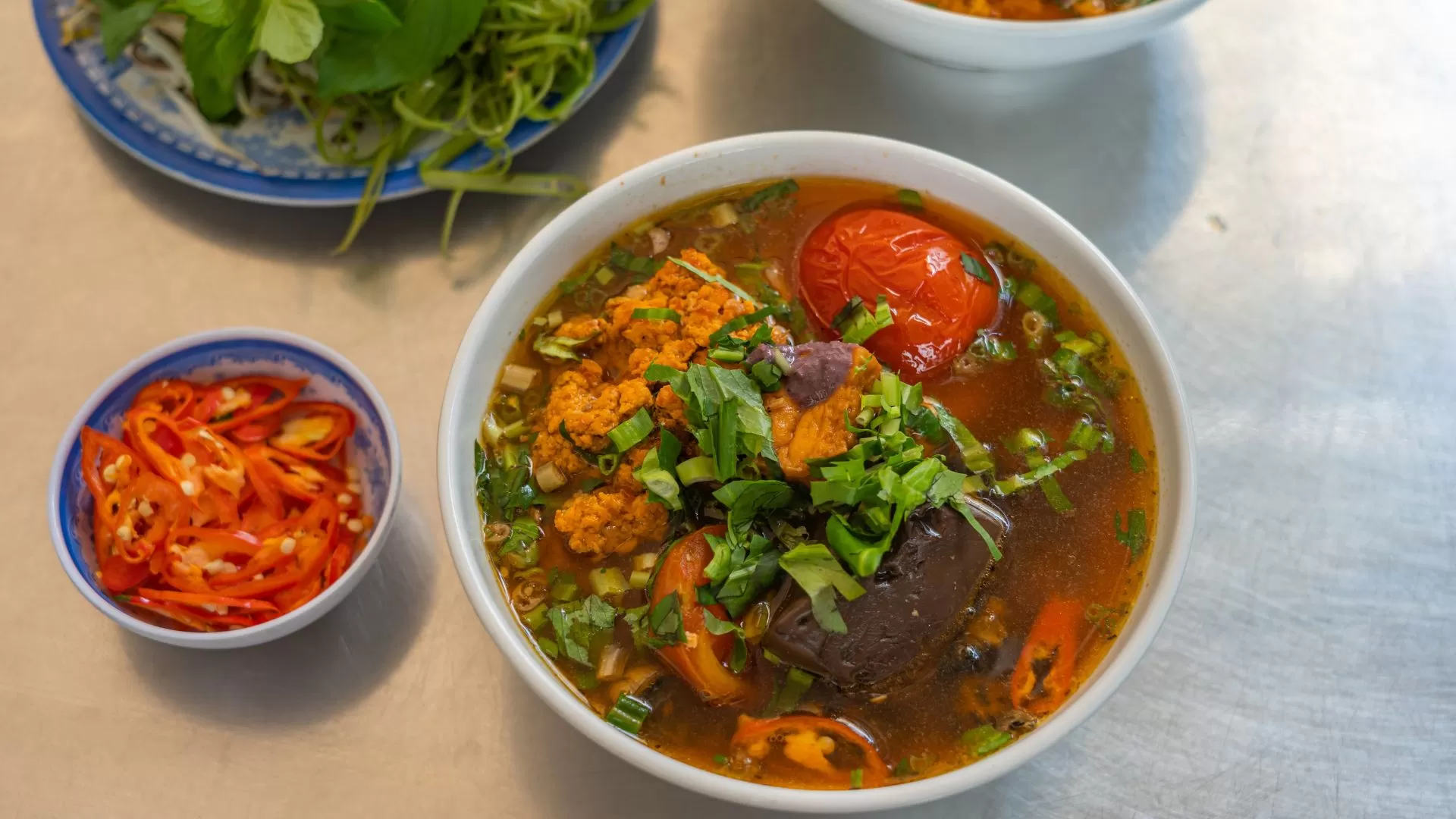 Les nouilles de crabe sont un plat aux saveurs prononcées du centre du Vietnam, qui séduit par son goût à la fois rustique et raffiné. Le crabe de Tra Co est finement haché, sa chair filtrée et cuite dans un bouillon gras, sucré et aromatique. À déguster, ce bol de vermicelles chauds à la chair de crabe onctueuse, garni d'oignons et de coriandre, accompagné de crudités fraîches et de feuilles de riz grillées, crée une expérience culinaire complète.