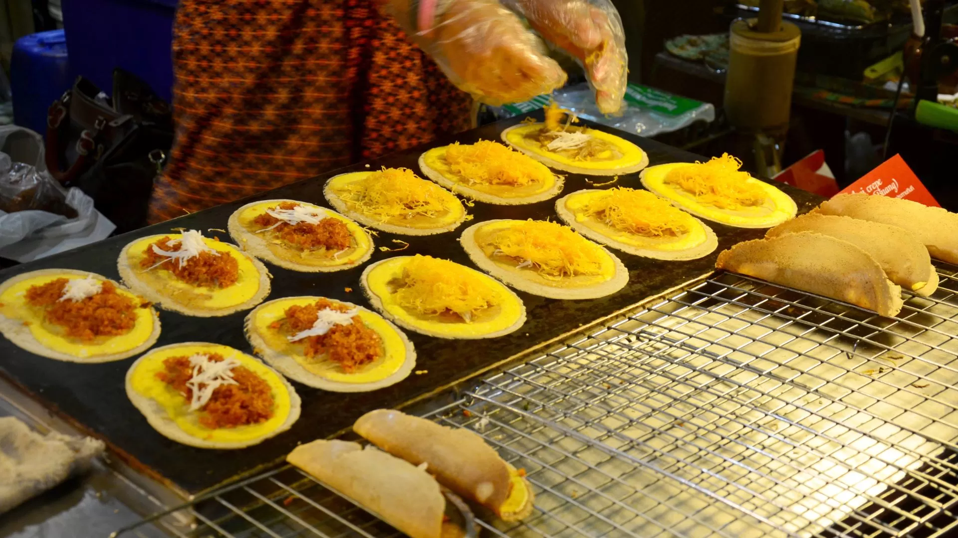 Les Khanom Buang, petites crêpes dorées aux allures de tacos miniatures, sont une véritable curiosité parmi les spécialités à Bangkok. Il se compose d’une fine pâte croustillante cuite sur une plaque chaude, garnie d’une mousse blanche à base de meringue ou de crème de coco, puis de filaments de jaune d’œuf sucrés (foi thong) ou de lamelles de noix de coco râpée.