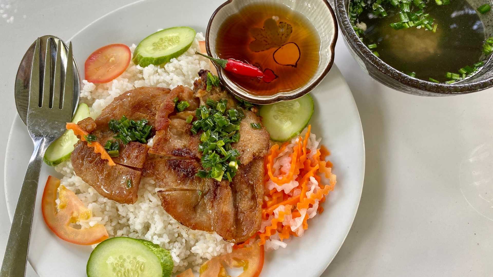 Com tam (broken rice): A typical Saigon meal served with grilled pork, egg, shredded pork skin, and pickled vegetables.