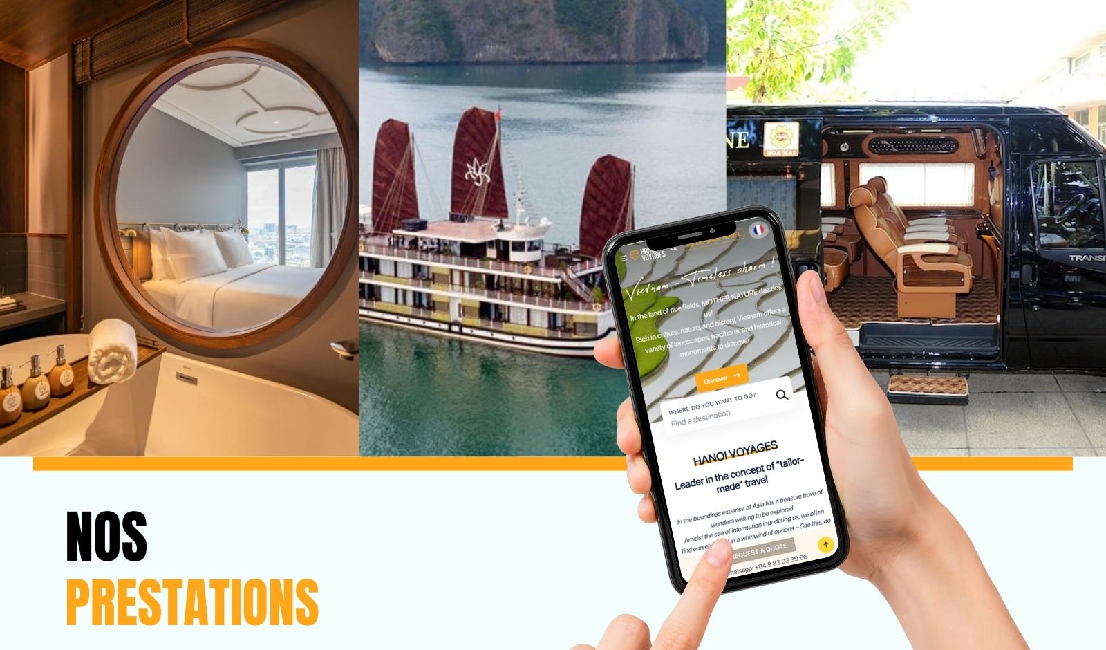 Embarquement pour une aventure inoubliable ! Une sélection aux petits oignons, avec les meilleurs guides francophones, pour un voyage sur mesure à votre image. La découverte des charmes du Vietnam en toute sérénité grâce à des options de transport terrestre bien rodées. L’immersion dans le rythme du pays à travers des solutions de transport ferroviaire. Et pour une expérience magique, une croisière dans la splendide baie d'Halong ou sur le majestueux Mékong. Avec Hanoi Voyages, la réalisation de votre voyage de rêve au Vietnam, au Cambodge, au Laos, en Thaïlande et en Birmanie.