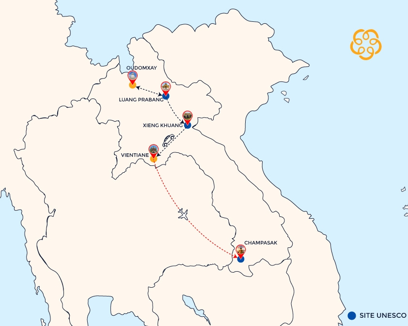 Lieu: Luang Prabang - Oudomxay - Muang La - Muang Ngoy - Nong Khiaw - Xiengkhuang - Vang Vieng - Vientiane - Champasak - Pakse - 4000 îles - Île de Khong - Île de Khone