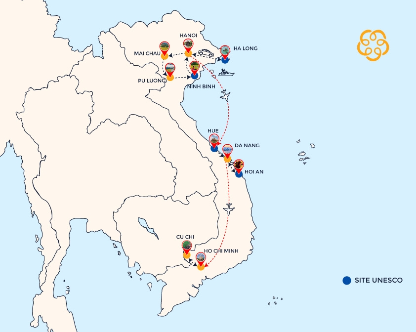 Lieu: Hanoï - Mai Chau - Pu Luong - Ninh Binh - Baie d'Halong - Hue - Hoi An - Ho Chi Minh - Cu Chi