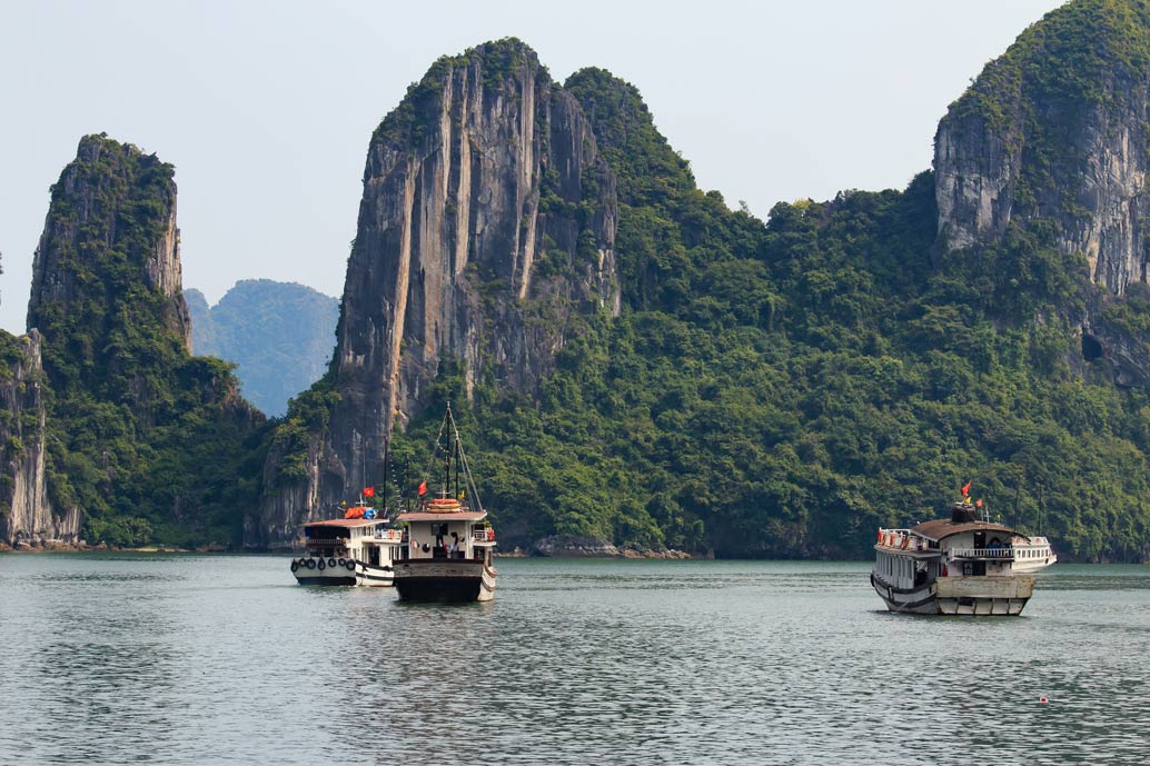 - La baie d'Halong, classée au patrimoine mondial de l'UNESCO, est réputée pour ses eaux couleur jade et ses roches calcaires.